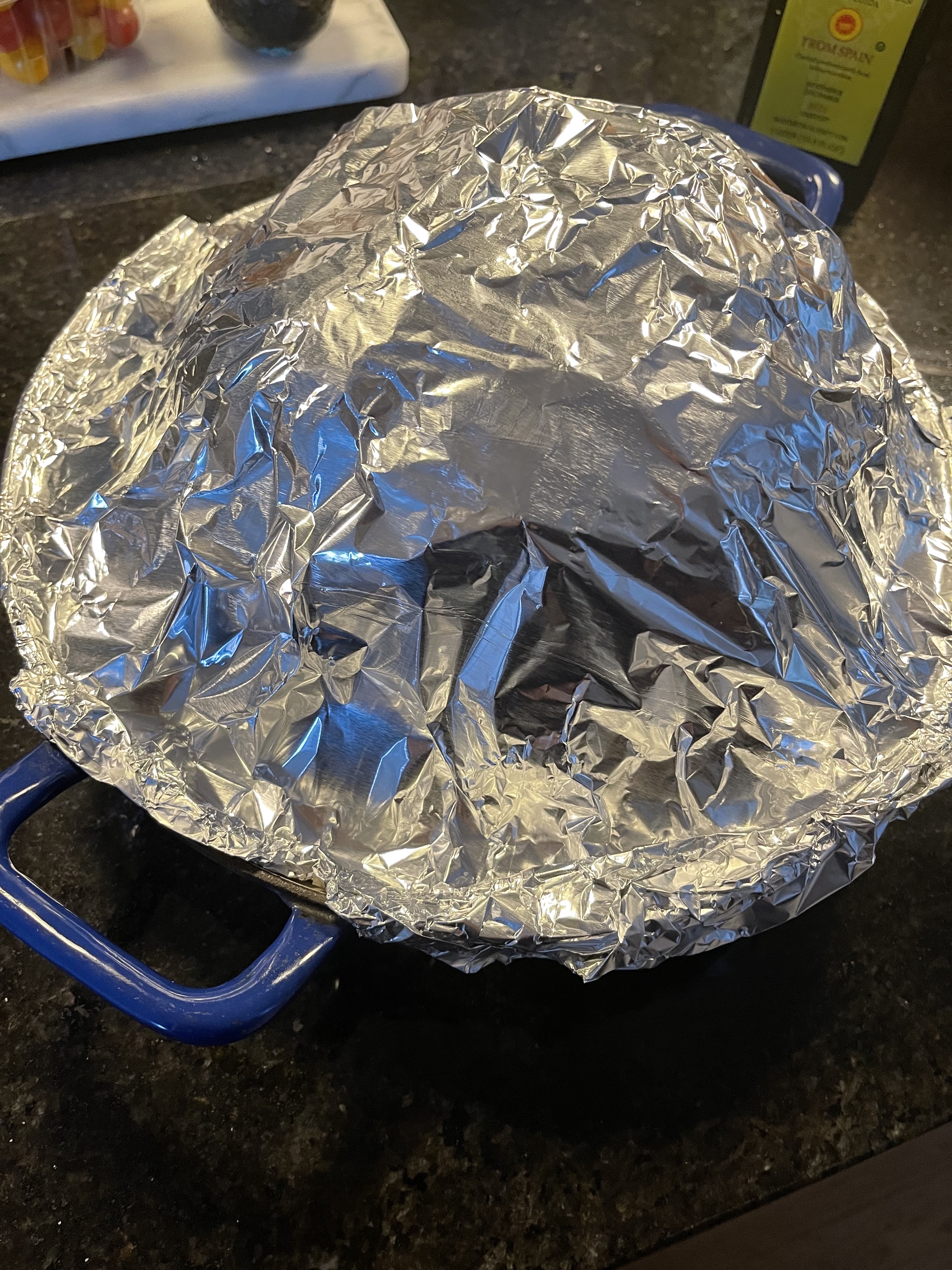 Place cauliflower in cast iron skillet or pan and cover tightly with aluminum foil. This allows the cauliflower to cook through without burning.