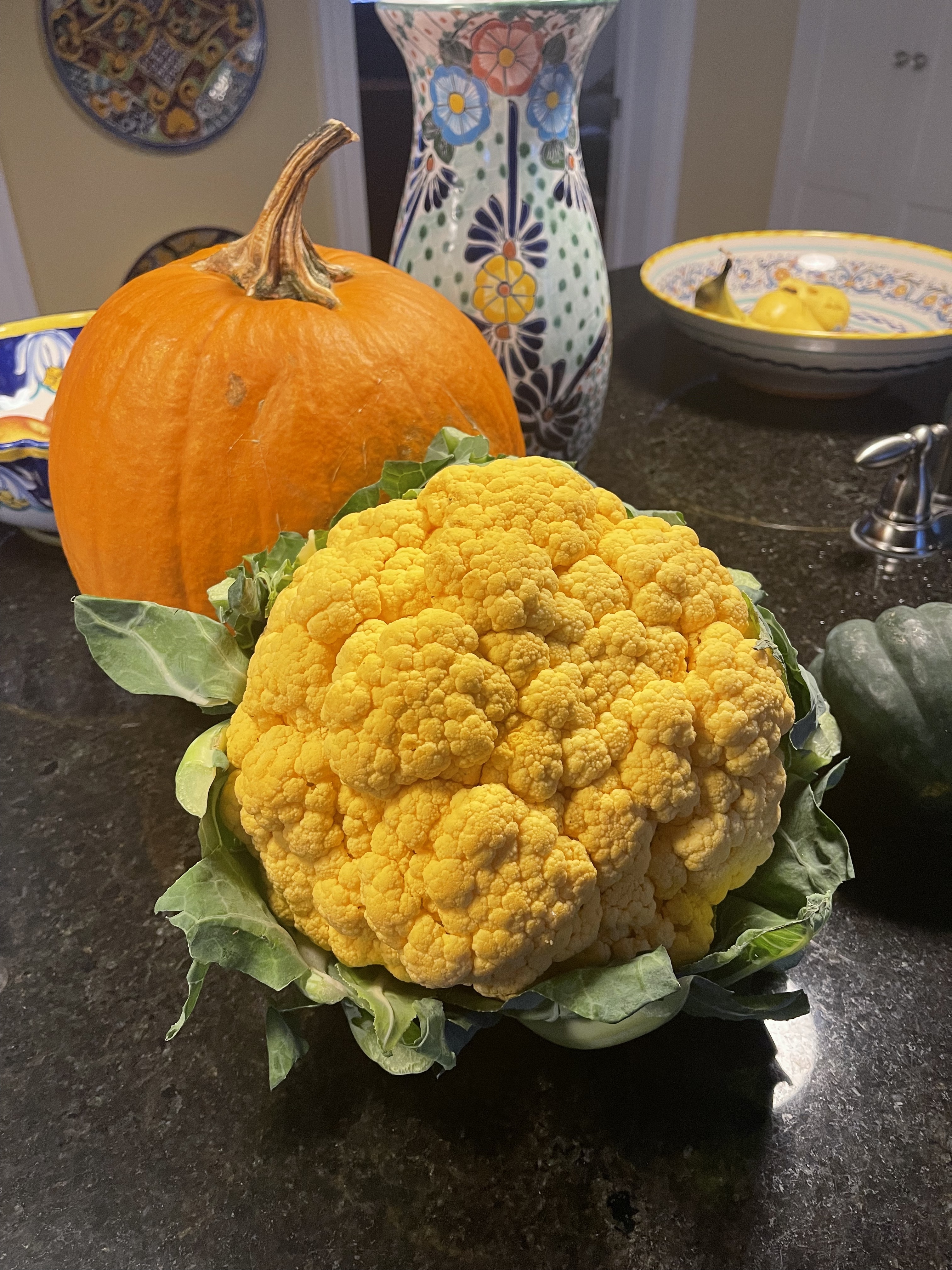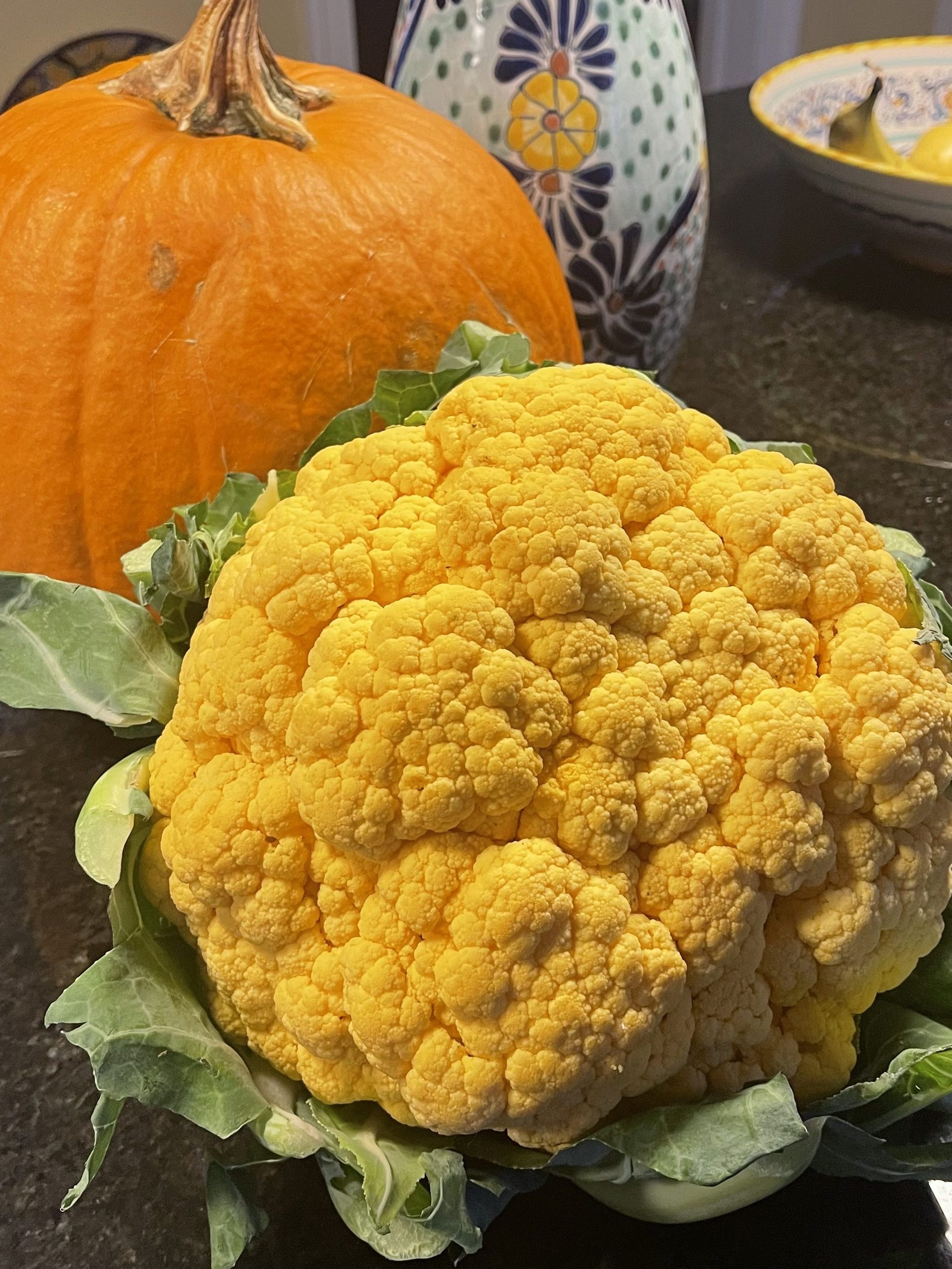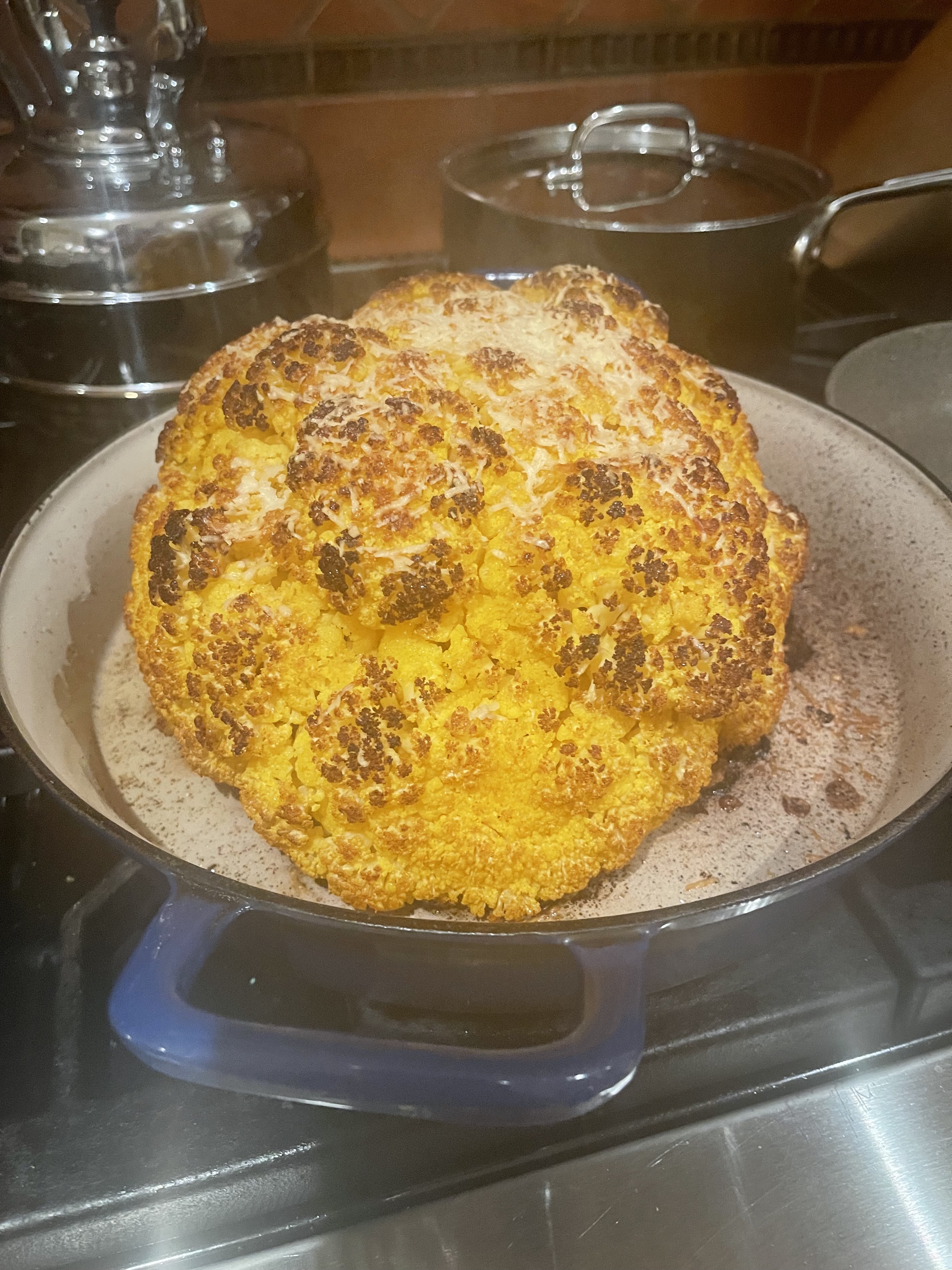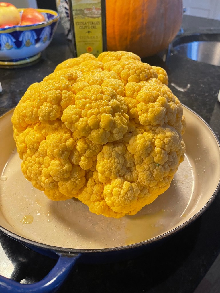 I found this enormous orange cauliflower at the local Farmers’ Market and felt inspired to prepare it whole…slow-roasted until the florets are falling off the stalk.